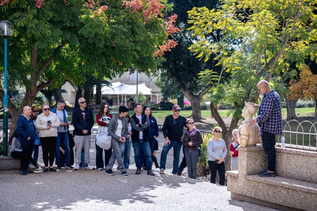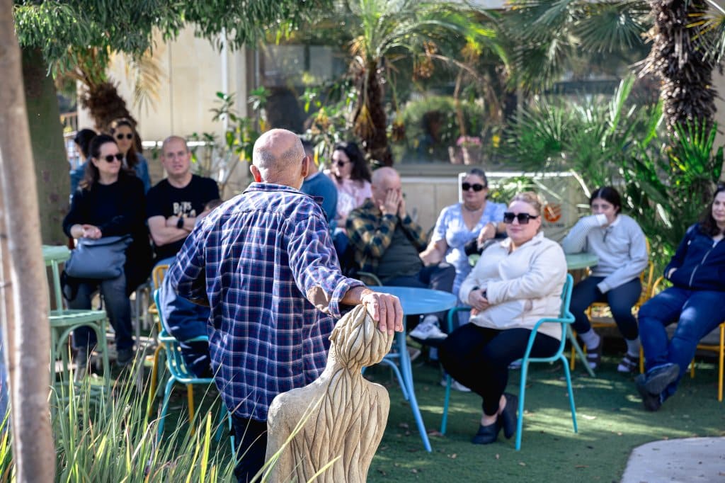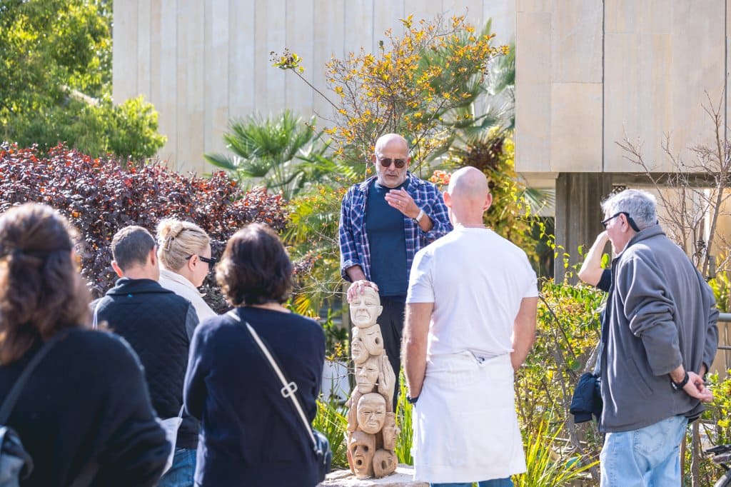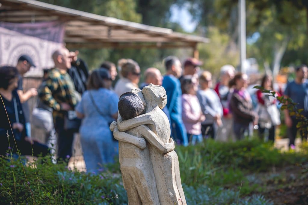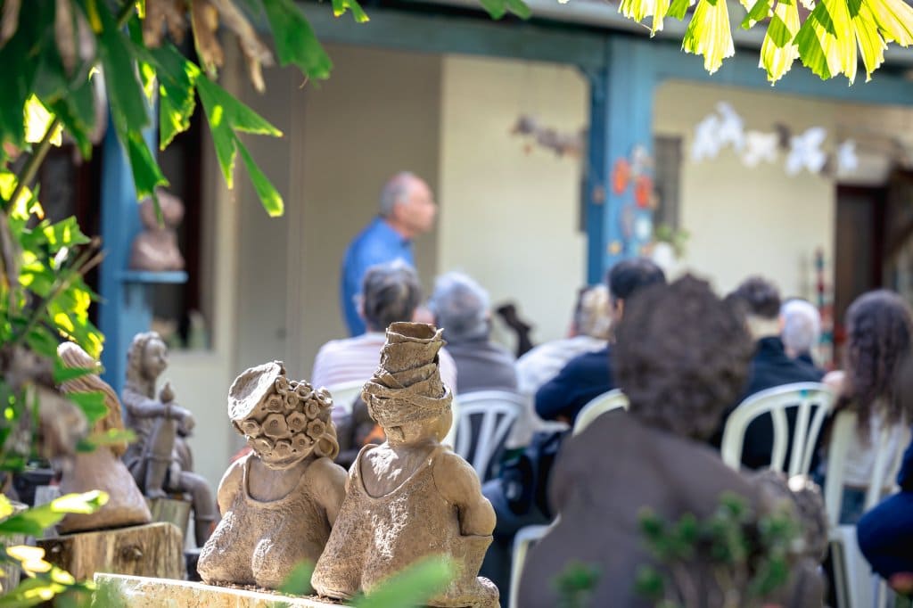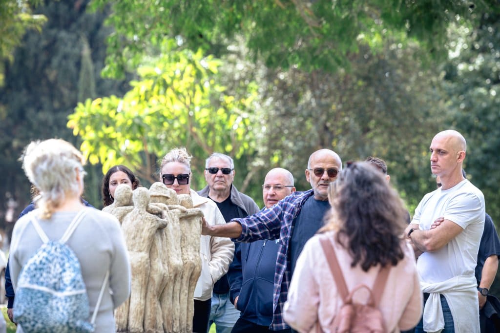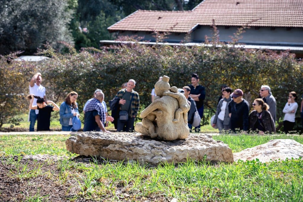 דני מקיים סיור רגלי בין פסליו המעטרים את המשק ומשוחח על מקורות ההשראה, החומר, השתקפות הקיבוץ בפסלים ועוד משמעויות נסתרות.