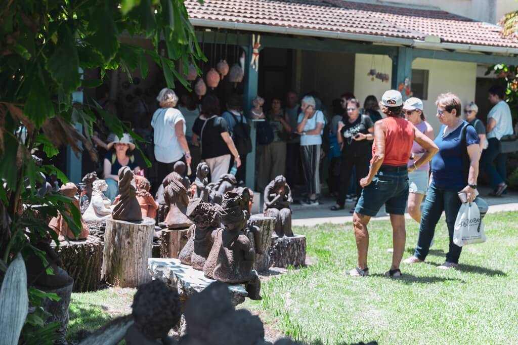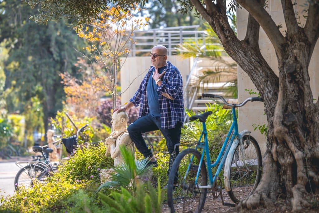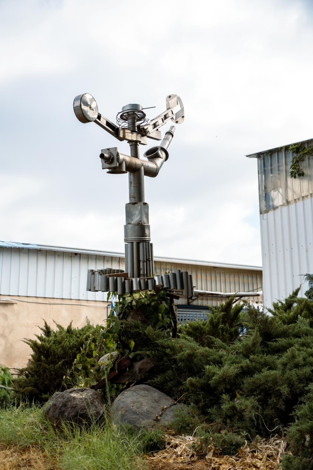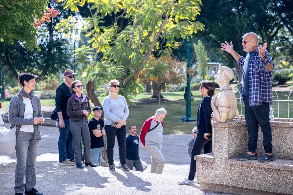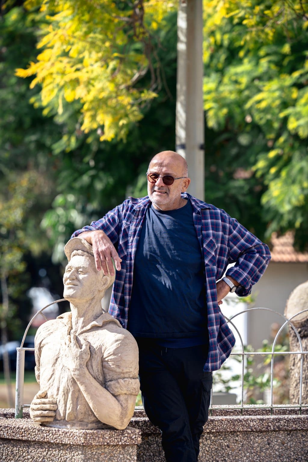 דני מקיים סיור רגלי בין פסליו המעטרים את המשק ומשוחח על מקורות ההשראה, החומר, השתקפות הקיבוץ בפסלים ועוד משמעויות נסתרות.