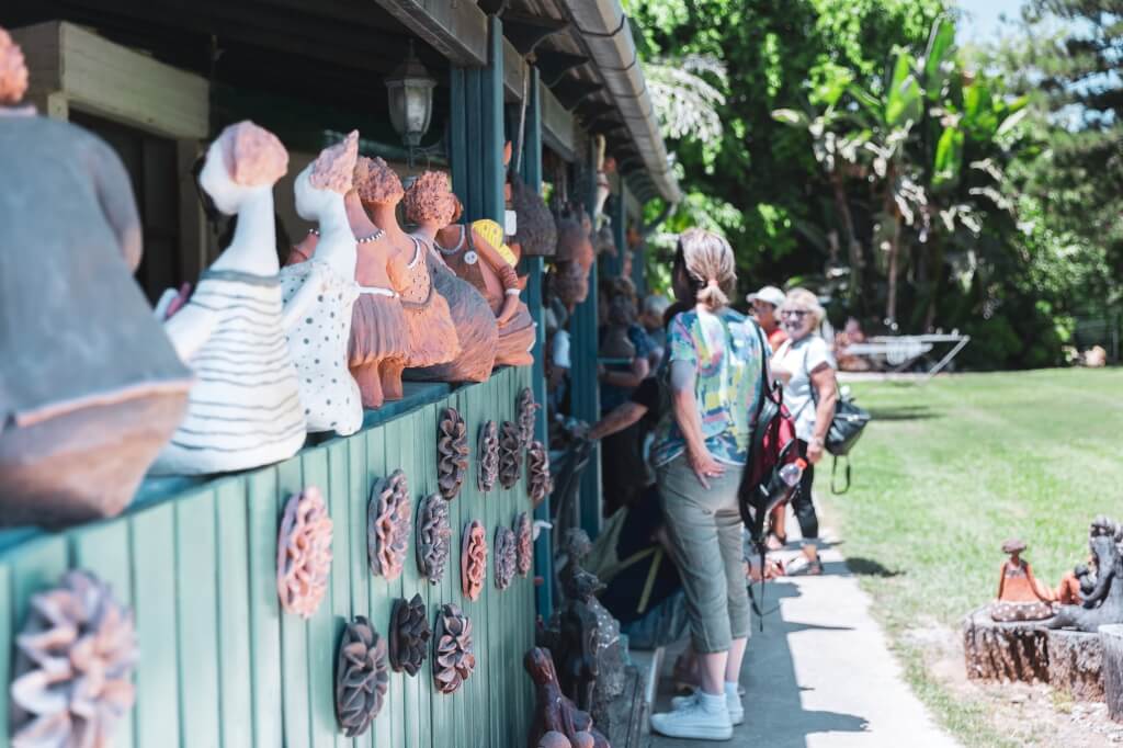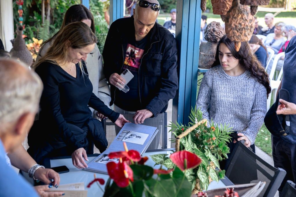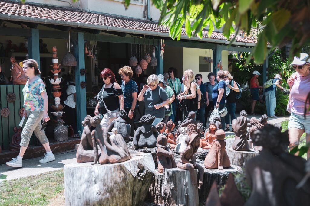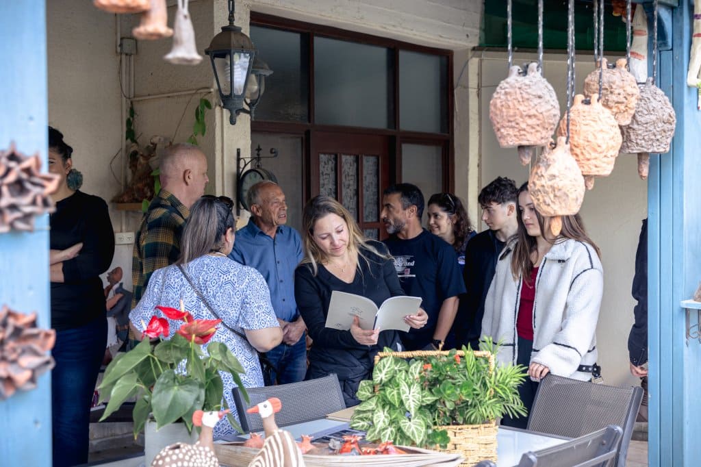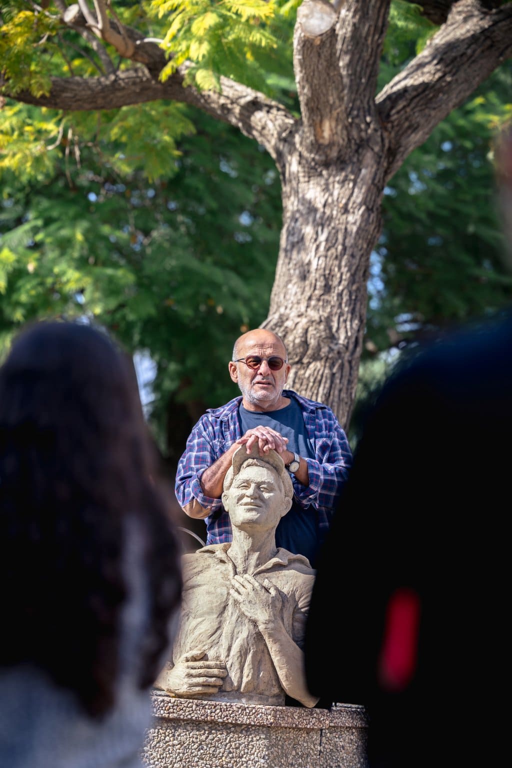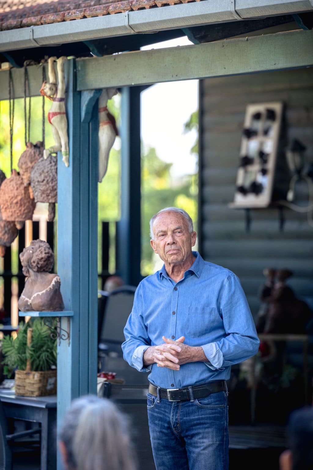 דני מקיים סיור רגלי בין פסליו המעטרים את המשק ומשוחח על מקורות ההשראה, החומר, השתקפות הקיבוץ בפסלים ועוד משמעויות נסתרות.